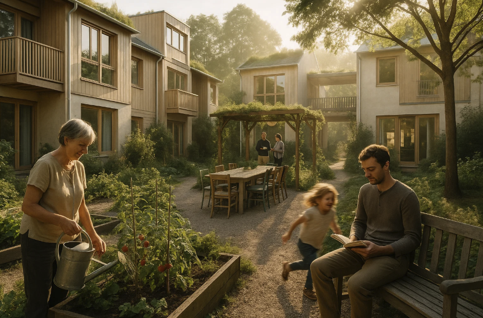 Écovillage circulaire avec potagers partagés, illustrant les nouvelles formes d’habitat collectif écologique