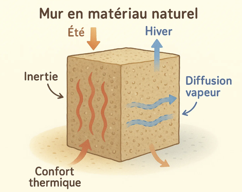 La terre crue possède des qualités physiques qui la rendent très performante. Elle régule naturellement l’humidité d’un bâtiment. En absorbant l’excès de vapeur d’eau et en la restituant lentement, elle améliore le confort intérieur sans équipement supplémentaire. Ce phénomène, appelé régulation hygrothermique, réduit aussi les risques de moisissures.